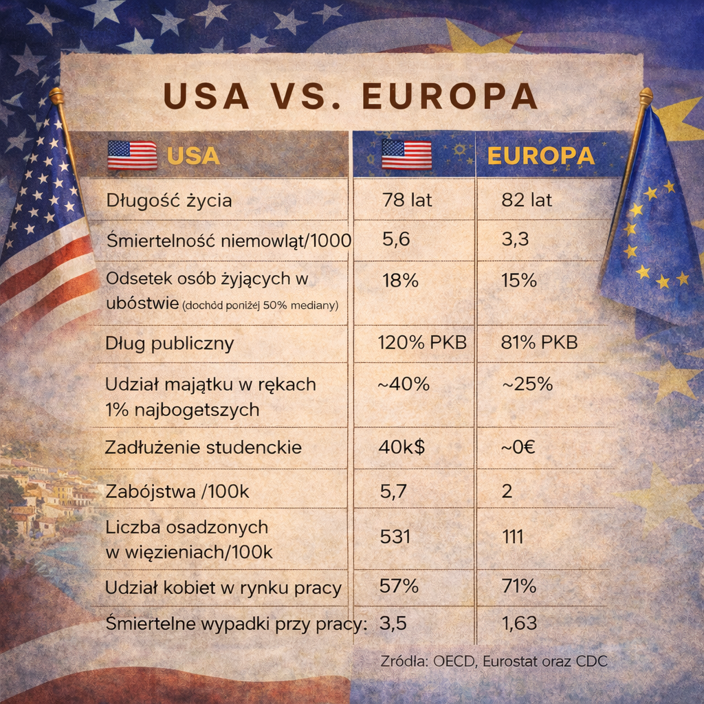 USA ma jedne z najwyższych nierówności dochodowych w świecie rozwiniętym. Europa — mimo problemów — pozostaje bardziej spójna społecznie. A długowieczność nie znosi skrajnych nierówności. Nie dlatego, że wszyscy muszą żyć identycznie. Dlatego, że zdrowe życie wymaga stabilności — a ta zanika, gdy klasa średnia się kurczy.