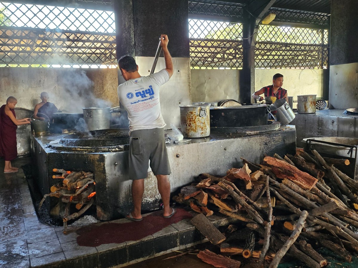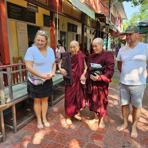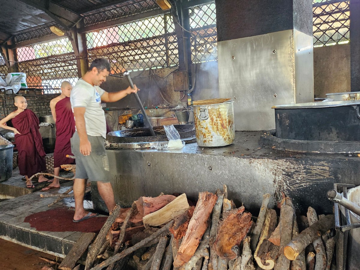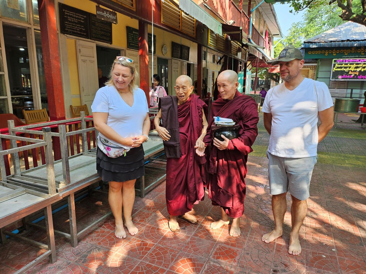 Dotarliśmy także do klasztoru Mahaganyong w Amarapurze, gdzie mieszka setka mnichów. Każdego dnia zbiera się, by otrzymać od mieszkańców pokarm. Sami nie mogą pracować, więc woluntariusze gotują dla nich w wielkich garach. Na jednym ze zdjęć pozujemy z ich 93-letnim „szefem”, który zaprosił nas do wspólnej fotografii.