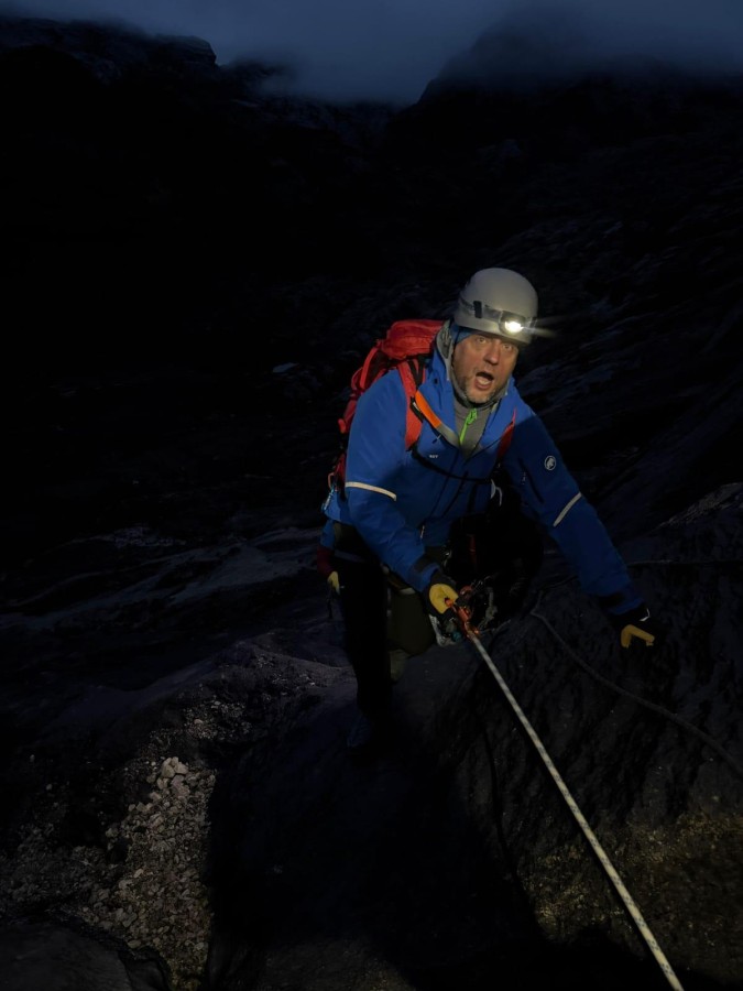 Pobudka 4 rano, start 5. Początkowo wszystko układało się dobrze. Pogoda była wyjątkowa dobra, słoneczna i stabilna, skała sucha, tempo równe. Mimo dużej ekspozycji, przejść na mostkach linowych czy wspinaczki po poręczówkach, już o 10.50 byliśmy na szczycie?
