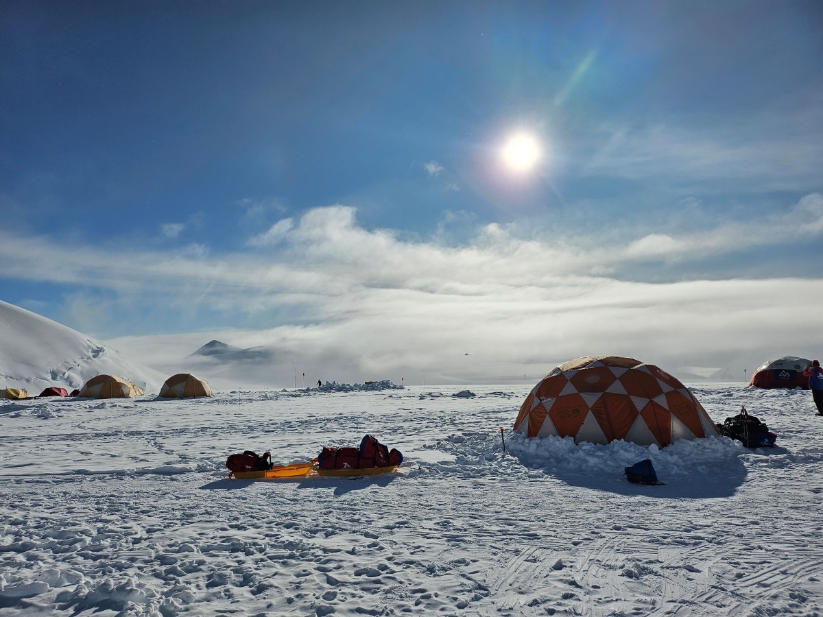 Lądujemy. zdjęcia Jesteśmy 5000 km od stałego lądu (Ameryki Południowej). W Base Campie spędzamy jedną noc. Baza jest dużo mniejsza niż ta, w której byliśmy wcześniej. Znajduje się tu kilkanaście namiotów i mesy techniczne. Warunki są tu komfortowe w porównaniu do tego, co będzie wyżej.